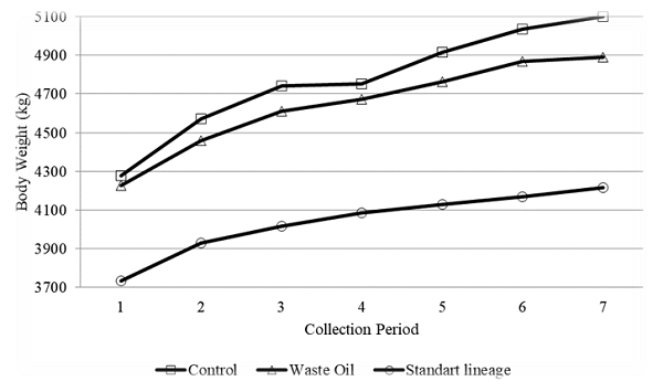 Figure 1 shows weight gain curves of animals from both treatments, as well as the expected lineage curve. There was a statistically significant difference between treatments during period three (p = 0.04) and seven (p = 0.04). In both periods, animals whose diet had soybean oil totally replaced by waste oil had lower body weight than control animals.