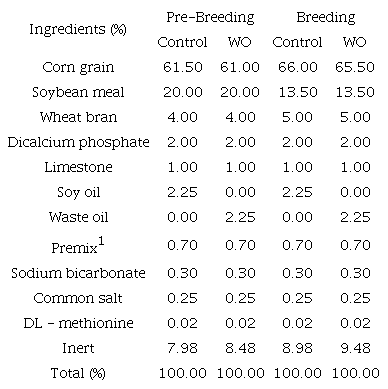 The experiment had two treatments, the first one (control) consisted of a diet based on corn, soybean meal, and soybean oil; and the second, the test diet (WO), had the soybean oil totally replaced by the waste oil of olive oil extraction. Diets composition for both treatments at different reproductive stages can be observed in Table 1 and the nutritional levels in Table 2. In addition, Table 3 shows the fatty acid composition of the waste oil. Super Crac program (TD Software Ltda®, Brazil) was used to calculate diets, which were isoenergetic and isoproteic for both treatments and life stages.