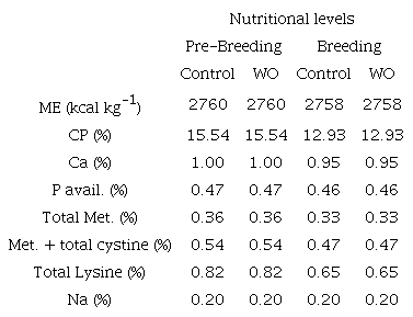 Two diet formulations for heavy-males were used, corresponding to nutritional requirements of pre-breeding (18 to 27 weeks) and breeding phase (28 weeks to the end), according to lineage recommendations.