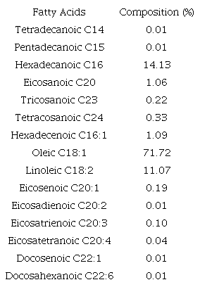 Oil from olives has high concentration of oleic acid, about 70%, and low concentrations of saturated fatty acids, mainly myristic and lauric (Mendoza et al., 2013; Wedyan, Abu Hanieh, Al Harasheh, & Altawaha, 2017). In soybean oil, concentrations are very different from olive oil: it presents only 14.5% of oleic acid, while myristic and lauric acids have high concentrations, 41% and 14.4%, respectively (Sadamade, Oyedepo, & Bolaji, 2013). According to Zambiazi, Przybylski, Zambiazi, and Mendonça (2007), ingestion of sources rich in saturated fatty acids are related to higher rates of plasma cholesterol and obesity. However, when increasing consumption of polyunsaturated fatty acids and monounsaturated ones present in olive oil, for example, the saturated profile is improved.