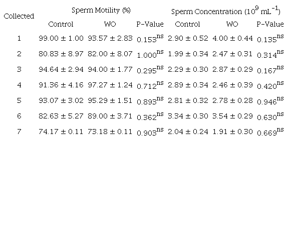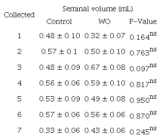 Means and standard errors of sperm volume are demonstrated in Table 4 and there was no statistical difference between treatments at the different collection periods for this variable (p > 0.05). In period 2, 4, and 6 it was necessary to transform the seminal volume data for [Arcsin (sqrt)] in both treatments.