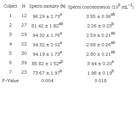 Although there was no statistical difference between treatments for motility and sperm concentration when all values are evaluated regardless of the treatment applied there was a difference between the collection periods for both variables (Table 6).