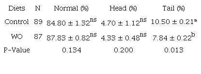 Table 7 presents means and standard errors of sperm morphology. It was necessary to transform the tail morphology data to [LOG (x)] in both treatments. There was no statistical difference (p > 0.05) between treatments regarding normal sperm cells and cells with head abnormalities. However, a significant difference (p = 0.01) was observed between treatments for cells with tail defects, where birds fed with residual oil in the diet had a lower incidence of defects.