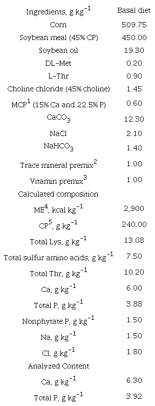 Before formulize the basal diet, soybean meal, corn and monocalcium phosphate, were analyzed for P (method 965.17 (Association Official Analytical Chemist [AOAC], 1990) and Ca (method 968.08 (AOAC, 1995)), also the percentage of Ca was measured in calcium carbonate. Basal diet was formulated thereafter and was dried at 55°C for 72h in an oven and ground through a 1-mm sieve, then used to measure dry matter (DM) (method 934.01 (AOAC, 1990)), Ca (method 968.08 (AOAC, 1995)) total P (method 965.17 (AOAC, 1990)).
