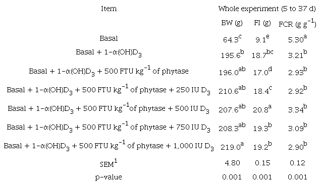In conclusion, supplementation of 1-α(OH)D3alone to basal diet containing low levels of Ca and P maximizes tibia mineralization, whereas supplementation of 1-α(OH)D3,phytase, and 1,000 IU cholecalciferol kg-1 of diet maximizes performance criteria, body weight and feed conversion ratio.