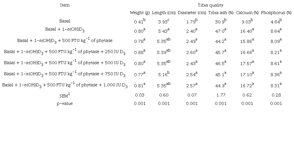 The present study was carried out to determine efficacy of 1-α(OH)D3 individually or in combination of microbial phytase and 1-α(OH)D3 in combination of microbial phytase and different inclusion rate of cholecalciferol in dietary containing inadequate levels of Ca and P on growth performance, tibia quality, plasma total mean ALP enzyme activity and minerals of broiler quails. The birds were reared under optimal environmental status and all processes including sampling and killing of the birds were done in agreement with the ethical guidelines of the Shahrekord University's Ethical Committee, Islamic Azad University, Shahrekord branch, Iran. A total of 280 mixed sex 5-d-old broiler quails (Coturnix japonica) were individually weighed and randomly allocated to 7 treatments with 5 replicates containing 8 quails. Water and feed were provided ad libitum and feed was presented in mash form during the experiment (5 to 37 d). A basal diet (Table 1) was formulated in accordance with National Research Council [NRC] (1994) recommendations except for Ca and P which were provided in inadequate levels and cholecalciferol as vitamin supplement which incorporated to basal diet did not contain cholecalciferol. The microbial phytase was provided at the inclusion rate of 500 FTU/kg of diet and was prepared commercially (ImEx Gulf, Inc., Texas, USA). The 1-α(OH)D3 consumed in the current trial was commercially provided (Vitamin Derivatives Inc., GA, US) and incorporated to treatments in the inclusion rate of 5 μg kg-1 of diet. The dietary treatments were as follows: Ca-P deficient diet (basal diet); basal diet + 500 FTU microbial phytase kg-1 of diet; basal diet + phytase + 5 μg of 1-α(OH)D3 kg-1 of diet; basal diet + phytase + 5 μg of 1-α(OH)D3 and 250 IU of cholecalciferol kg-1of diet;basal diet + phytase + 5 μg of 1-α(OH)D3 and 500 IU of cholecalciferol kg-1of diet; basal diet + phytase + 5 μg of 1-α(OH)D3 and 750 IU of cholecalciferol kg-1of diet; basal diet + phytase + 5 μg of 1-α(OH)D3 and 1,000 IU of cholecalciferol kg-1of diet. The birds were reared on a lighting program including a period of 23h light, and 1h darkness d-1. The broiler house temperature was kept at 37°C, on the first day of experiment and gradually reduced to 24°C in the initial of fourth week and then fixed on it.