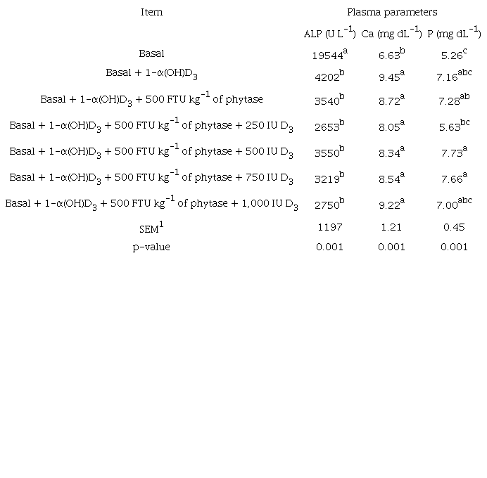 Supplementation of 1-α(OH)D3 and phytase, and 1-α(OH)D3,phytase and 500, and 750 IU cholecalciferol kg-1 of diet to basal diet significantly enhanced (p < 0.05) plasma P concentration. ALP enzyme activity is an index for the assessment of vitamin D insufficiency (Misra, Pacaud, Petryk, Collett-Solberg, & Kappy, 2008). Accordingly, cases without high plasma ALP enzyme activity may be excluded from a distinction of vitamin D insufficiency. Thus in the current trial addition of 1-α(OH)D3 alone could decrease elevated plasma ALP enzyme activity as an indicator of vitamin D deficiency and consequently increase absorption of Ca and P.