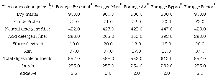The treatments consisted of roughage extruded with different additives: Foragge Essential® (essential oils), Foragge Max® (Virginiamycin®), Foragge AA® (unpurified inactive yeast), Foragge Bypro® (Tannin), and Foragge Factor® (purified inactive yeast). Foragge® feed is an extruded product from Urochloa forages, enriched with minerals, vitamins, starch, and the tested additives. Diet composition is listed in Table 1.