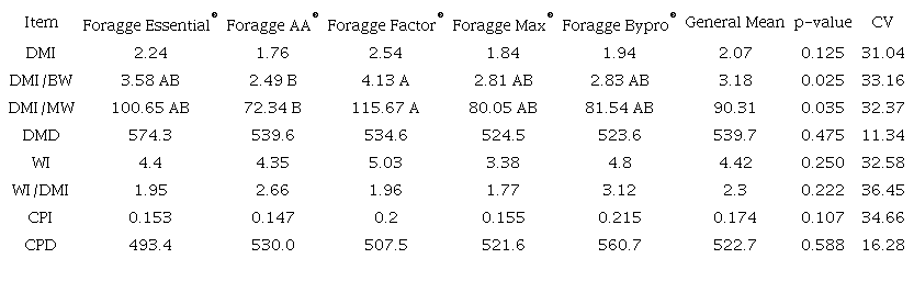 However, DM in relation to body and metabolic weight was significantly different between treatments (p < 0.05). According to Hudson and Christopherson (2018) regard intake through metabolic weight (MW) is more effective, because it is a basis for expressing energy metabolism in maintenance requirement. Where, the animals that consuming Foragge Factor® had the highest DM/BW and DM/MW and the lowest values were found with Foragge AA®. The inclusion of purified inactive yeast increased by approximately 58% DM/BW compared to Foragge AA®.