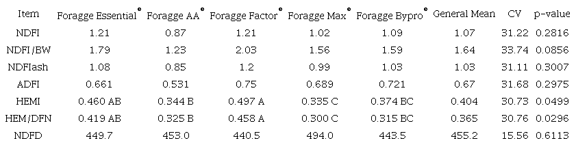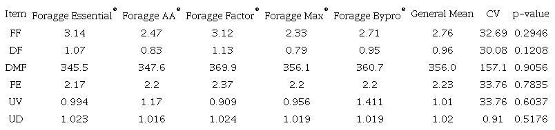 Foragge® feed was produced with the purpose of partially or totally replacing corn silage, a fact proven by chemical values close to those found in the Foragge® product in question (Table 1). According to Valadares Filho (2006), the average chemical composition of corn silage produced in Brazil has 71.8 CP, 27.9 EE, 539.8 NDF, and 294.9 ADF g kg-1 and dry matter digestibility of 595.8 g kg-1. These values are similar to those found in Foragge® products.