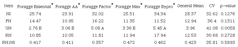 Urinary nitrogen (UN) was different between treatments (p < 0.05), with the highest values found in the Foragge Bypro® (tannin) and Foragge Factor® (purified yeast) treatments. Retained nitrogen (RN) was similar between treatments (p > 0.05). Therefore, for these treatments mentioned above, even with higher nitrogen excretion via urine, nitrogen retention was not influenced. Nitrogen excreted via urine is found as urea, which is formed in the liver from excess N, which was quickly converted to rumen ammonia (Van Soest, 1994).