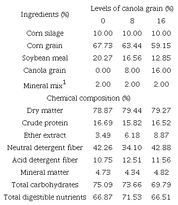 The treatments consisted of three levels of inclusion of canola grain, on a dry matter basis (% DM): 0, 8, and 16%. Diet was weighed and supplied as complete feed, the mixture was made at the time of supply (silage + concentrate), individually ad libitum, in two daily meals (8:00am and 4:00pm), allowing 10% leftovers of the amount provided by the calculated margin of the previous day and water ad libitum. The source of forage used was corn silage and the concentrates were balanced according to NRC (2007) in order to be isoproteic (Table 1) to provide gains of 200 g day-1. The forage: concentrate ratio was 10:90 in DM.