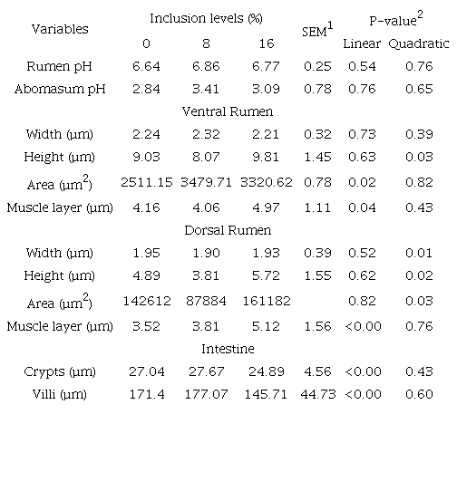 When studying the introduction of new ingredients in the diet for lambs, it is important to evaluate the histometric aspects of the rumen and intestine, since the use of food happens in the gastrointestinal mucosa, as its epithelium has specificity for digestion, absorption and metabolic transport of nutrients, as well as, some physiological functions that correspond to the ruminal papillae and intestinal villi (Xu et al., 2009). In addition, rumen and intestine are considered an adaptive environment that changes according to the diet, the first undergoes changes in its epithelium particularly in the size of ruminal papillae, in adaptation to changes in ruminal parameters, such as pH, concentration of fatty acids and osmotic pressure. The second modifies the contact area in the lumen of the intestine according to the food ingested, adapting to meet the nutritional needs of the animal (Martens, Rabbani, Shen, Stumpff, & Deiner, 2012; Zitnan et al., 2008).