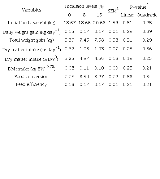 The performance variables (Table 3) did not differ with levels of inclusion of canola grain, emphasizing the principle of normal distribution of samples in their initial body weight (Nóbrega et al., 2014).