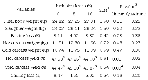 Despite the reduction in HCY and CCY, the values were within the normal range for sheep for meat production, between 40 and 50%. Santos, Ezequiel, Pinheiro, Barbosa, and Galati (2009) tested the inclusion at 8% canola grain in lamb diets and found HCW and CCY of 45.62% and 46.12%, respectively.