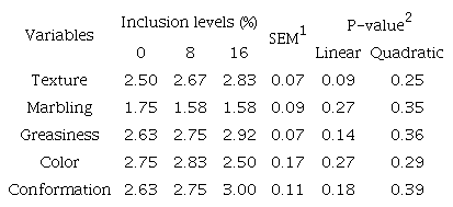 The subjective characteristics (Table 5) were not affected by the diet, remaining unchanged under the linear and quadratic effect of the regression analysis.