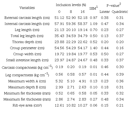 Biometric measurements (Table 6) of the carcasses and characteristics of the rib eye area (REA) were not influenced by the levels of canola grain in the diet, corroborating the data by Marques et al. (2007), who stated that the morphometric measures are poorly influenced by nutritional management, as long as the animals are slaughtered with similar weights.