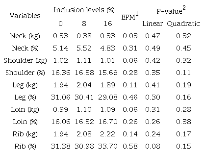 Despite the decreasing linear effect of the use of canola grain on hot and cold carcass yield, the weights and yields of commercial cuts were not influenced (Table 4), which may be related to the low correlation coefficient (r = 0.29) in regression analysis when considering the inclusion of canola in relation to the variables analyzed. However, with uniformity of the slaughtered animals, these characteristics are important for commercial cuts.