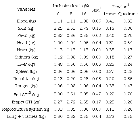 According to Andrade et al. (2009), the development of non-carcass components usually accompanies the animal weight, therefore, animals with similar slaughter weights explain the lack of effect on the characteristics of non-carcass components of animals fed different levels of canola grain.