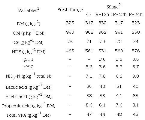 The content of fermentation end-products was analyzed. An aqueous extract was prepared with 25 g of silage and 300 mL of deionized water and homogenized in a Stomacher® (MARCONI-MA 440/CF). Then, it was centrifuged at 10,000 × g for 15 min. at 4°C, and the lactic acid content (Pryce, 1969) and volatile fatty acids were quantified. Volatile fatty acids content was determined using a gas chromatograph coupled to a mass spectrometer (GCMS QP 2010 plus, Shimadzu, Kyoto, Japan) and were detected using a capillary column (Stabilwax; Restek, Bellefonte, PA, USA; 60 m, 0.25 mm, i.d., 0.25 m). Butyric acid was not detected in the silages. Butyric acid content was not detected in the silages.