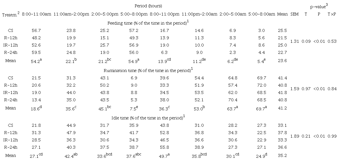 Silage intake was higher during the first 12h of the day after the first feeding (8:00am-8:00pm) than during the subsequent 12h (8:00pm-8:00am), corresponding to 79.0% of the total feeding time during the 24-h period. The intake peaks occurred mainly between 8:00-11:00am and 5:00-8:00pm.