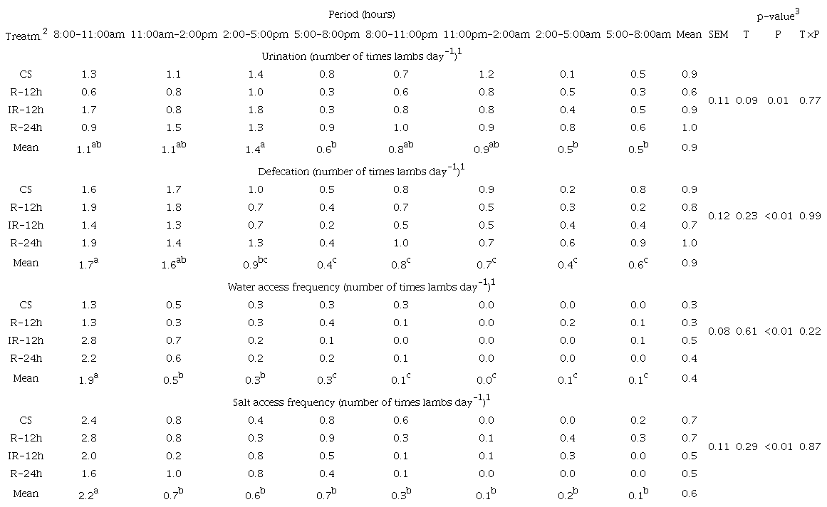 The urination frequency is a variable that is closely related to water intake, whether from the feed or direct water intake. Therefore, it is understandable that the higher urination frequencies occurred in the morning periods, consistent with the water access frequency by lambs. The defecation rate, in turn, may be associated with the amount of feed intake, which was higher during the periods 8:00-11:00am and 5:00-8:00pm.