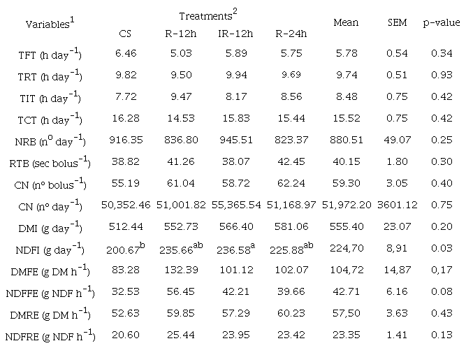 Where the total feeding time (TFT), total rumination time (TRT), and total idling time (TIT) of each animal during 24h were calculated by summing the observations, in minutes, of each activity performed during the data collection period. The chews numbers (CN) in no bolus-1 and rumination time per bolus (RTB) in s bolus-1 of each animal were determined using a digital chronometer. Observations were recorded at four different periods of the day (8:00am-2:00pm, 2:00-8:00pm, 8:00pm-2:00am, and 2:00-8:00am), with three observations per period for each animal. The total chewing time (TCT) in h day-1, number of ruminal bolus (NRB) in no day-1, and CN in no day-1 were determined according to Burguer et al. (2000).