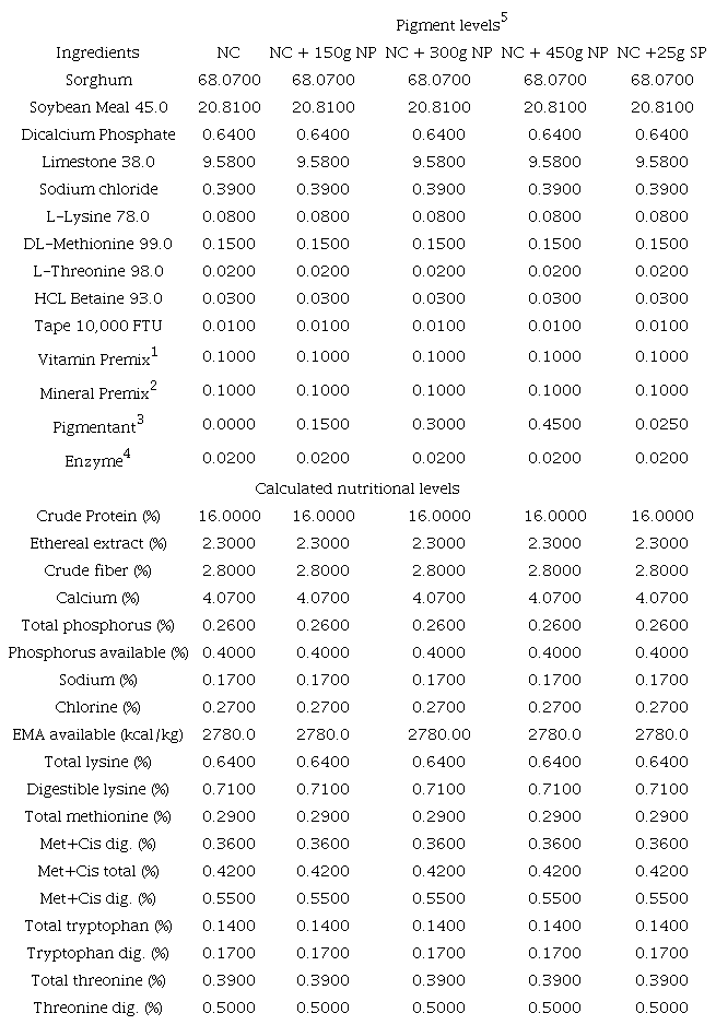The treatments used were: NC - Negative control diet based on Sorghum without supplementation with pigments; 150 g t-1 - NC feed supplemented with 150g t-1 of Yellow Natural Pigment feed (NP - Wisdom Golden Y-20 - Marigold 2%); 300 g t-1 - NC feed supplemented with 300g t-1 of yellow natural pigment feed; 450 g t-1 - NC feed supplemented with 450g t-1 of Yellow Natural Pigment feed; 25 g t-1 - NC feed supplemented with 25g t-1 of yellow industrial synthetic pigment feed (SP -Carophyll Yellow 10%). Pigments were obtained from commercial companies that offer such products.
