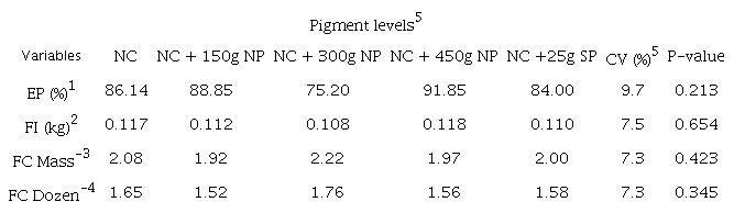 There were no significant differences (p > 0.05) of the variables of productive performance, feed conversion by mass and per dozen, egg production and feed intake, according to the treatments with pigments used in the study, according to Table 2.