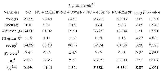 The variables of yolk, shell and albumen percentage, specific gravity, average egg weight, shell thickness, and Haugh unit did not present significant differences (p > 0.05) as a function of the carotenoids of inclusion of pigments according to Table 3. Only the variable yolk color showed significant difference (p < 0.01), with higher yolk color according to the increase in the inclusion of the natural pigment.