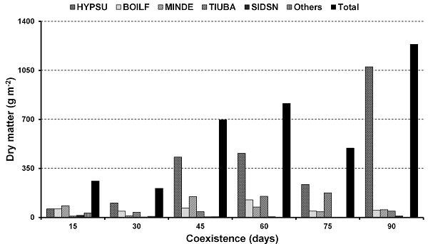 Total accumulated dry matter of the infesting community increased during the experimental period, reaching 1235.0 g m-2 at 90 DAR, approximately four times over that found at 15 DAR. This demonstrates the rapid initial development of weeds and may indicate possible competition with forage plants for common resources such as water, sunlight and nutrients (Figure 1).