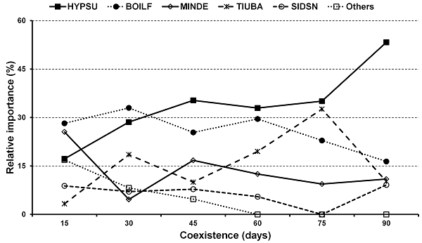 The other species exhibited RI values below 10% in all periods studied (Figure 2). However, this does not mean that these species have not competed for common resources in the area, seeing that they participated in the plant community as a whole.