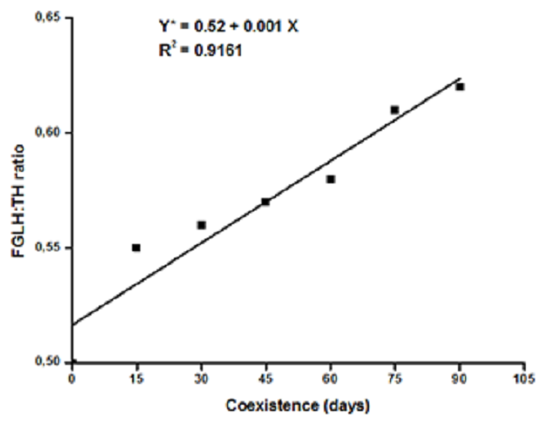 The tiller stem diameter had a significant difference only for the 90-day treatment. Although the treatments did not exhibit a statistically significant difference for the first green leaf height (Table 2), the ratio of the first green leaf height to the tiller height (FGLH:TH) increased linearly as the coexistence periods increased (Figure 3).