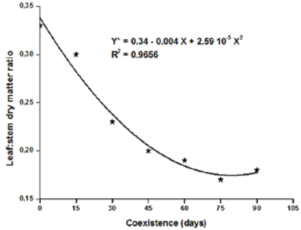 Changes in the morphogenic structure of U. ruziziensis can also be seen in the ratio of leaf dry matter to stem (leaf:stem), which in this study decreased following quadratic proportions as the period of coexistence with weeds increased (Figure 4).