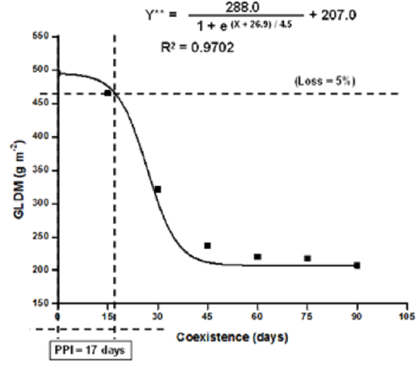 Thus, it is suggested to adopt control measures up to 17 days of coexistence, corresponding to the period prior to interference (PPI), considering a tolerable loss of 5% in the yield of green leaf dry biomass (Figure 5).