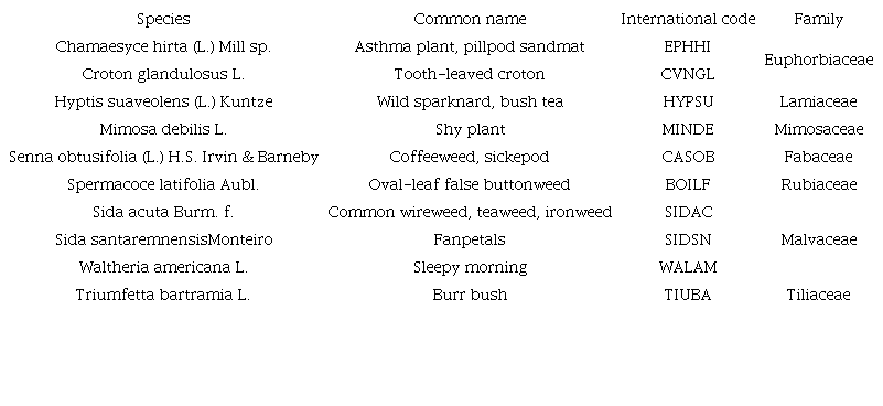 In the evaluations of the infesting community carried out during the experimental period, ten dicotyledon weed species distributed in seven families were found. The family Malvaceae was the most representative, with three species, followed by the family Euphorbiaceae, with two species (Table 1).