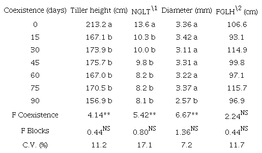 In the absence of interspecific competition, U. ruziziensis exhibited a statistically higher tiller height. There was a 26% reduction if we compare the periods of 0 and 90 days of coexistence with the infesting community (Table 2).
