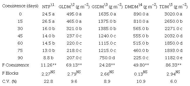 The weed plants also influenced negatively total dry matter production, as it decreased proportionally to the increasing coexistence periods. The longest interference period (90 days) yielded an accumulated dry matter of 1838.0 g m-2, a reduction of approximately 61% in relation to the control period (Table 3).