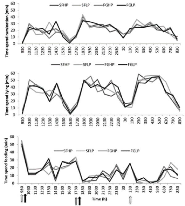 As you can observe in Figure 1, time spent feeding peaked after offering feed in the morning (0930) and afternoon (1730) and return from milking (0130). These increases coincided with a decrease in ruminating and lying times. Feed delivery had more influence on feeding time than return from milking, and cows spent more time on feeding after morning and afternoon feed delivery in comparison with return from milking without feed delivery on midnight. As a result, higher proportions of feed are consumed immediately after the delivery of fresh feed. In agreement with our results, DeVries et al. (2010) reported that the diurnal feeding pattern of dairy cows was mostly influenced by the time of feed delivery, feed push-up and milking, and feed delivery is the primary factor effecting daily feeding activity pattern.