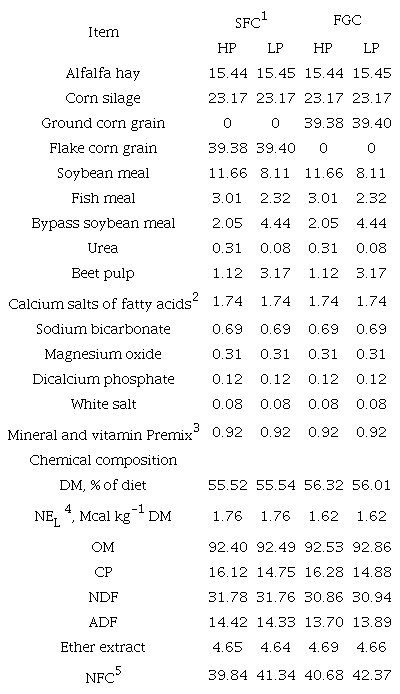 A 2 × 2 factorial arrangement of treatments was used to provide two levels of protein (HP or LP) and two processing methods of corn (FGC or SFC). Consequently, diets were: steam flaked corn with high protein content (SFHP), steam flaked corn with low protein content (SFLP), finely ground corn with high protein content (FGHP), and finely ground corn with low protein content (FGLP, Table 1). High-protein and low-protein diets had 16.3% and 14.8% of protein on DM basis, respectively. Diets contained 40% corn as either finely ground or steam flaked. Forage comprised corn silage and chopped alfalfa hay. Forage to concentrate ratio was 40:60 on a DM basis. Feed was provided daily at 0930 and 1730 h and orts were weighed daily before feeding. Feed offered was adjusted daily to supply about 10% in excess of feed consumed.