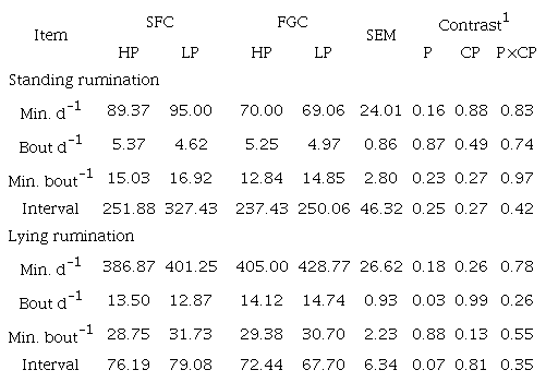 In general, cows spend most of rumination time in lying than standing (Steensels et al., 2012). In the studies conducted by Grant et al. (1990) and Norring et al. (2012), milk production was 28 and 38 kg d-1, and the cows ruminated 477 and 427 min. d-1, respectively. In our experiment using high producing dairy cows (45 kg d-1), the rumination time was 476 min. d-1, which is similar to previous studies, indicating that the production level did not affect the amount of rumination. However, cows in the studies of Grant et al. (1990) and Norring et al. (2012) spent 61% and 66% of rumination while lying respectively, which was lower than our experiment. These results suggest that when milk production and DMI are increased, the cows spend more time ruminating while lying, and they probably spend most of their standing time on eating. In contrast, Norring et al. (2012) reported that higher-yielding cows spent more time ruminating while standing and less time lying than lower-yielding cows.