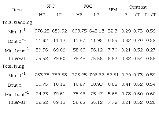 The treatments and their interaction had no effect on total lying and standing times (Table 4). Across all treatments, cows spent 12.9 h d-1 on lying (separated into 10.7 bouts d-1 with an average duration of 76.2 min. bout-1) and 11.1 h d-1 on standing (separated into 11.6 bouts d-1 with an average duration of 60.9 min. bout-1).