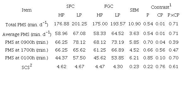 The effect of treatments on PMS is shown in the Table 5. Cows fed HP diets had lower total PMS (176 vs 197 min. d-1; p = 0.01) and average PMS (58.6 vs 65.8 min. d-1; p = 0.01) compared with cows fed LP diets. The LP-fed cows had higher PMS at 0900h (76 vs 67 min.; p = 0.04) than HP-fed cows. The LP-fed cows had higher eating and chewing times than cows fed HP diets (Table 2), and probably these cows spent more time for feeding after milking.