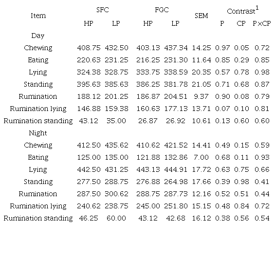 The corn processing and treatment interactions had no significant effect on behavior activity during the day (0600 to 1800h) and night (1800 to 0600h) (Table 6). Cows fed LP diets had higher chewing activity (434.9 vs 405.9 min.; p = 0.05) and tended to have higher rumination activity (202.9 vs 187.5 min.; p = 0.08) during the daytime than cows fed HP diets. Cows fed LP diets had higher chewing activity (Table 2; 862 vs 817 min. d-1; p < 0.01) than cows fed HP diets, and this increase in chewing activity happened in daytime and cows had similar chewing activity at nighttime. Chewing activity was not different during the daytime (420.4 min.) and nighttime (420.0 min.) in all treatments. The eating (224.8 vs 128.7 min.) and standing (387.3 vs 277.0 min.) activities were higher during the daytime than nighttime, and rumination (195.2 vs 291.2 min.) and lying (331.4 vs 440.4 min.) activities were lower in day than night.