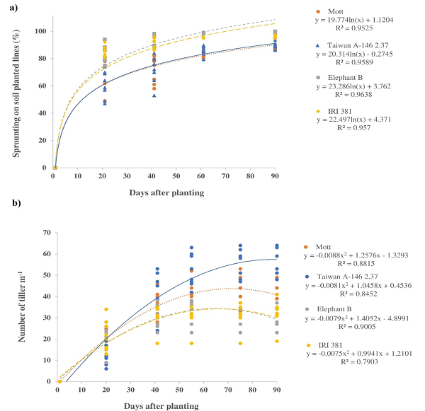 Tall genotypes (Elephant B and IRI 381) showed greater field sprouting rates (p < 0.05) (Table 2), ranging between 95-99%, while Mott and Taiwan A- 146 2.37 had sprouting rates of 88 to 90%, respectively. The greatest difference was between Elephant B compared to Mott, approximately >10%. All genotypes showed best-fit quadratic models in the relationship between field sprouting rate and days after planting (Figure 1a). At approximately two months after being planted, the genotypes tended to cease or stabilize their field sprouting.