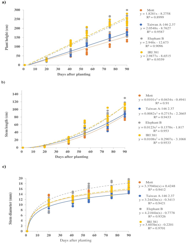 Plant height, stem length, stem elongation rate, and stem diameter were superior in tall genotypes (p < 0.05) (Table 2). Elephant B and IRI 381 average plants heights, 238 and 241 cm at 90 days, respectively, were taller than Mott and Taiwan A-146 2.37, 160 and 166 cm, respectively. Elephant B and IRI 381 had a stem length of 108 cm on average, which was greater than Mott and Taiwan A-146 2.37, average 88.28 cm. Elephant B had the largest stem diameter average of 19.2 mm (p < 0.05). All genotypes had best-fit linear functions in the relationship between plant height and days after planting (Figure 2a), while stem length showed best-fit quadratic functions (Figure 2b). Stem diameter displayed best-fit with a logarithmic regression in the function of the days after planting. A large increase in diameter was noticed in the first 20 days of growth in all genotypes, followed by slow-steady increase up to 90 days, when the last measurement was taken (Figure 2c).