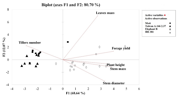 Forage accumulation, forage accumulation rate, dry matter concentration and stem biomass were superior in tall genotypes (p < 0.05) (Table 2), at 90 days establishment period. Taiwan A- 146 2.37 showed the lowest leaf biomass of 1.30 t DM ha-1 (p < 0.05), while Mott did not differ from the tall genotypes (p > 0.05). The leaf/stem ratio and the number of expanded leaves were superior in Mott (p < 0.05) (Table 2). Forage biomass accumulation in Elephant B and IRI 381 were 9.8 and 8.4 t DM ha-1, respectively, while Mott and Taiwan A- 146 2.37 had 5.4 and 5.1 t DM ha-1. The PCA analysis showed that the dwarf genotypes were more nearly similar to each other (F1 68.6% axis) (Figure 3) and were more uniform in terms of their sward structure. Dwarf genotypes were characterized by a greater number of tillers; however, it did not reflect in greater or comparable forage accumulation compared with the tall genotypes.