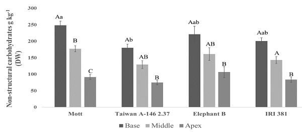 Elephantgrass genotypes harvested at 90 days showed differences in NSC concentration only at the base of the stems (p < 0.05) (Figure 4). Mott showed greater concentration of NSC at the base of the stem compared with Taiwan A-146 2.37 (p < 0.05), while Elephant B and IRI 381 showed intermediate concentration. Comparing the genotypes, there were no differences (p > 0.05) in NSC concentration in the middle of the stem nor at their apex (Figure 4). In all genotypes a pattern was observed with NSC concentration decreasing from the base of the stem to the apex (p < 0.05); the middle part, in general, showed intermediate values (Figure 4).