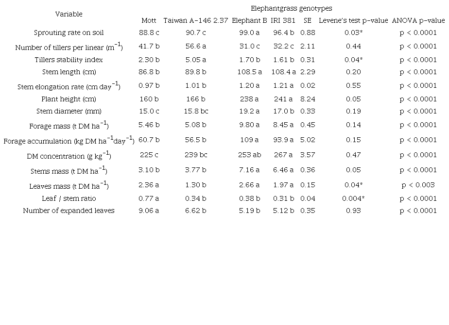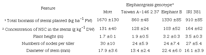 Superior forage biomass accumulation noticed in Elephant B and IRI 381 genotypes were associated with their genetic potential to produce longer, heavier and thicker stems (Table 2). In elephantgrass plantings, stem thickness is directly associated with greater dry matter yields (Oliveira et al., 2013). Despite the fact that tall genotypes showed a smaller number of tillers, their tillers were robust and heavier. Additionally, DM concentration in tall genotypes tended to be greater, especially compared with Mott. In terms of establishment, all genotypes showed satisfactory results, and differences in biomass accumulation in the first 90 days of growth were considered a mere consequence of the genetical potential of each genotype.