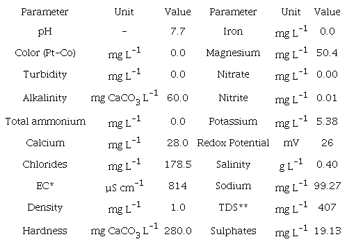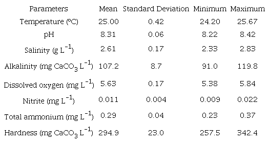 Water quality parameters of shrimp ponds were evaluated biweekly in triplicates according to recommendations of Boyd and Clay (2002). Biweekly measurement values were used to calculate average values and standard deviation during the cultivation cycle. The temperature measurements were carried out at the average depth, using a mercury thermometer with a resolution of 0.1ºC. Salinity, pH, and dissolved oxygen were assessed using a refractometer, a portable digital pHmeter, and an oximeter, respectively. The Golterman, Clymo, and Ohnstad (1978) titulometric methods were used to measure alkalinity and water hardness. Nitrite and total ammonium concentrations were determined according to Mackereth, Heron, and Talling (1978) techniques.